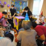 「トリックオアトリート!」利用者様も職員も、お面・帽子・耳付きカチューシャなどでおばけや動物に扮してハロウィンパーティーがスタートしました。大口を開けたモンスターを新聞紙ボールで一斉攻撃‼普段とは違う食堂・レクリエーションルームの雰囲気に気分が上がり、熱気が漂っていました。からだを動かした後は手作りかぼちゃプリンで締めくくり😊楽しくて美味しいハロウィンパーティーでした。